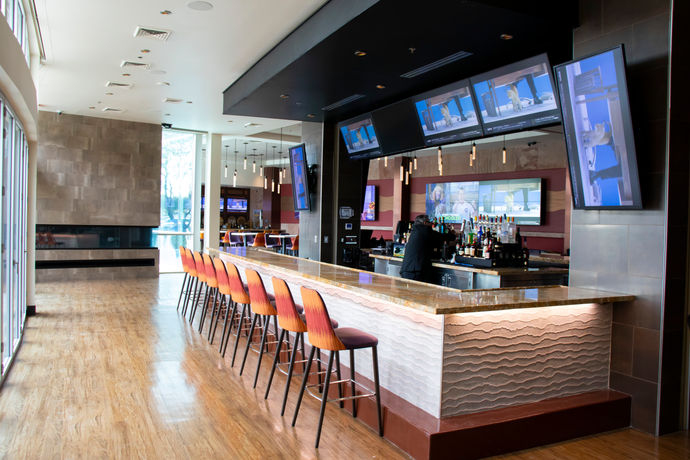 This tenant improvement and remodel project involved upgrading a 5,100 square-foot sports bar and restaurant within Casino Arizona. The renovation included the installation of a new bar area featuring metal laminate cabinetry and cladding at the entry portals. Decorative acoustic wall panels were added throughout the space, along with fresh paint and vinyl wall coverings. The main bar received upgraded ceramic tile and finishes, and the soffit of the main bar was reframed and refinished. Additionally, perforated metal paneling was applied to the patio trellis. The project also involved the installation of power and data infrastructure to support the restaurant's updated audio-visual system, which includes movie theater-quality projectors, TVs, and a ticker at the main bar soffit, enhancing the overall customer experience.