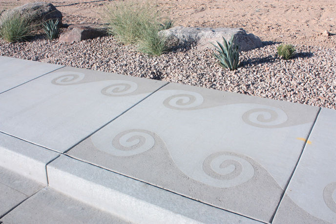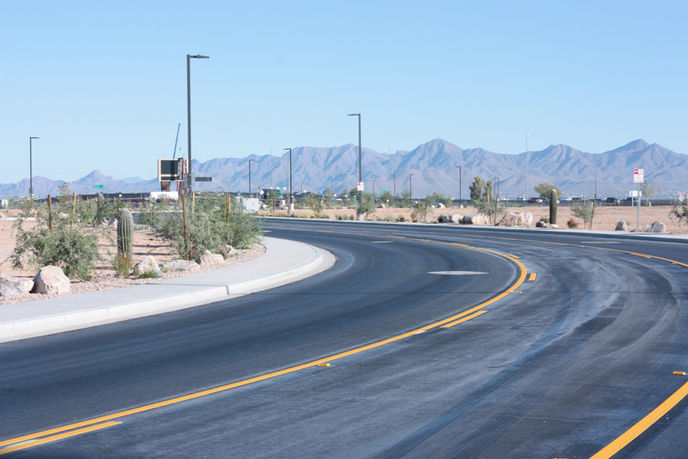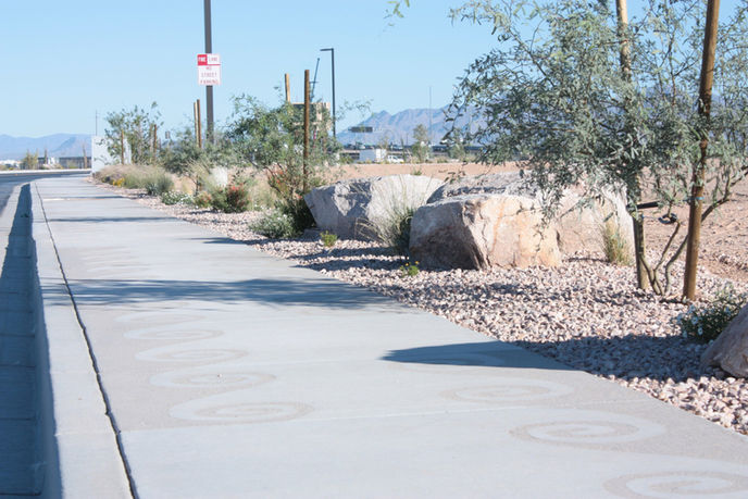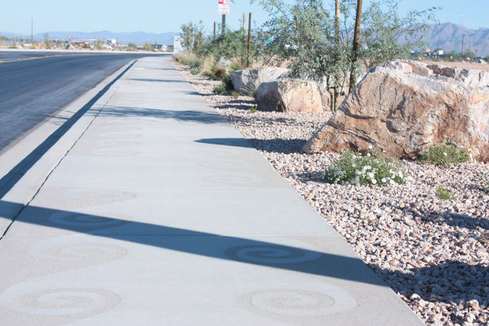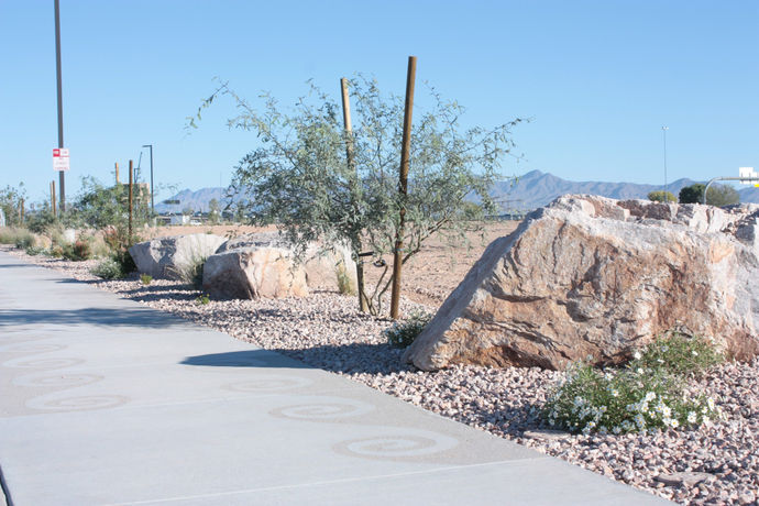 Notable Pima-Maricopa cultural features were thoughtfully integrated into the design, including sandblasted coyote tracks and water designs etched into the sidewalks. The project also included two large, custom entry monuments, each featuring multi-color concrete columns designed to resemble rammed earth, showcasing distinctive cultural elements at the entryways. Additionally, significant earthwork was completed to create retention basins, and 700 linear feet of underground storage systems were installed to ensure effective water management across the site.
